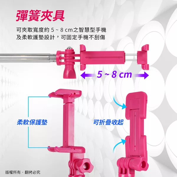 方便攜帶不佔空間,使用方式簡單,只需將手機固定於彈簧夾具上