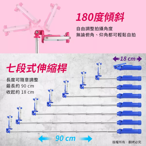 擁有七段式伸縮,最長約90cm(不含手機架),收起時僅約18 cm